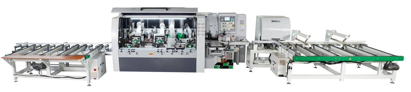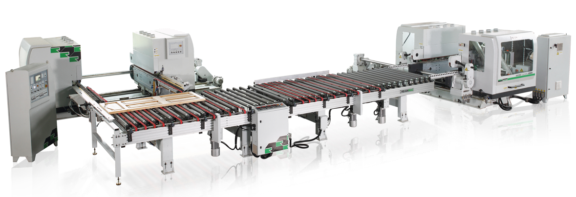 RMD+RMD 双端铣 + 双端铣生产线广泛适用于实木和板材或复合材料的木门、防火门、柜门、家具枱面等板状工件四边齐边、成型的连续加工,一次完成任务。可根据您的需要设计不同的布线组合方案。