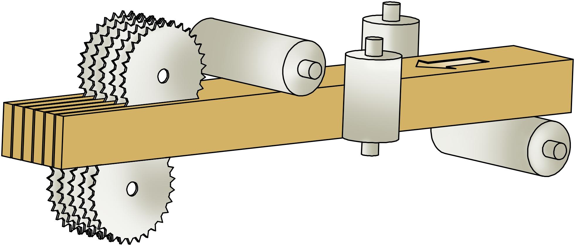 12.气动压紧式送料轮,可分段调整压紧力,有利于厚度不同的木料的送进畅顺。